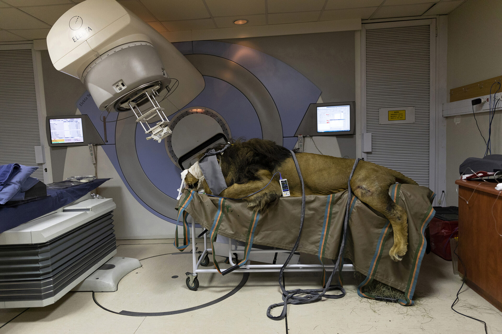 Rescued as a cub and hand-reared by Mattie and Eddie van Eck of Lory Park Zoo outside Johannesburg, Chaos was diagnosed with a rare squamous cell carcinoma on his nose and flank. “Due to the location of the tumor on the nose and the fact that the lion is not easy to handle, excision of the tumor was not possible,” according to lead wildlife veterinarian Dr Katja Koeppel who diagnosed this and decided on the treatment. The decision was made in consultation with Prof Gerhard Steenkamp, another experienced veterinarian, to try radiation therapy. The 570 lb cat was darted, transported to Pretoria, and then wheeled into Mediclinic Muelmed on a metal gurney like a human patient for four weekly treatments that cost his owners more than $4000.